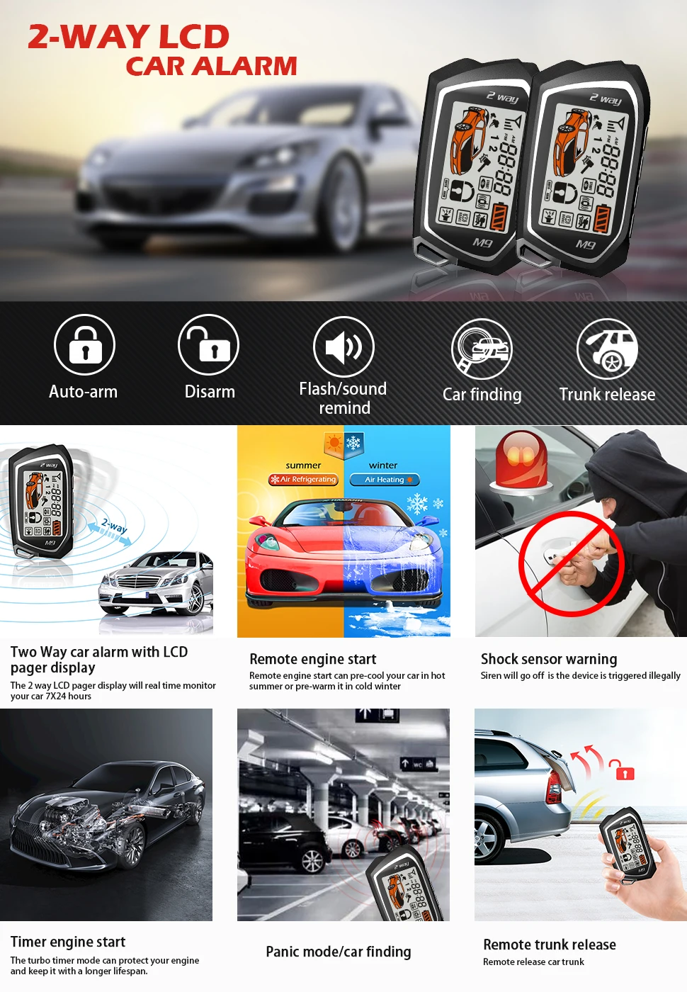 We offer high quality products and free shipping to New Zealand. Anti-hijackingFeature Function 1Vibrating alarming programmable2Sleeping mode optional3Multi-channels negative output4Auto-arm. 2-Way Car Alarm Security Alarm w LCD Status Display and Remote Engine Start 8200.
